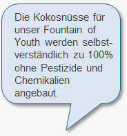 Unser Fountain of Youth kommt direkt aus der Nuss in die Dose und erhält sich somit die maximale Frische. Es schmeckt natürlich süß mit einer leicht nussigen Kokosnote. Es ist unser absolutes Lieblingsgetränk und jeder der Lust hat sollte es einfach mal probieren. Wir haben in unserem Hotel Gäste aus der ganzen Welt und somit die Möglichkeit ein direktes Feedback zu bekommen.